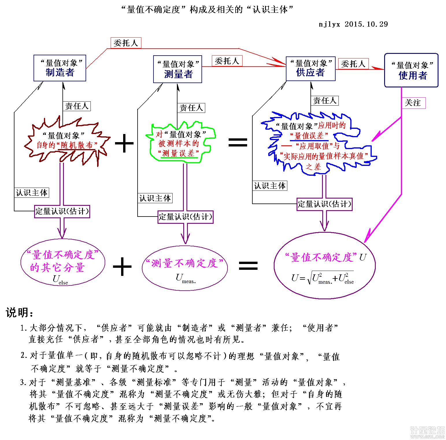 本帖最后由 njlyx 于 2015-10-29 22:10 編輯 thearchyhigh 發(fā)表于 2015-10-29 21:03 我們彼此的思緒似乎不在一個頻道? 兩相岔開了。 “量值對象”本身的“隨機分布”雖然通常都少不了要靠若干“測得值”來“統(tǒng)計”獲取相應(yīng)“不確定度”的主要成份(也還會通過“分析”,“合理”的附加一些成份,所謂“B類評估分量”),但這部分“不確定度”的大小是與“測量”工作的“好壞”無關(guān)的!.......如果“量值對象”本身的“隨機分布”很可觀,那么,即便“測量”工作做的近乎完美(——“測量誤差”小的可以忽略不計),這部分“不確定度”依然會該這么大就這么大! 將“這么大”的“不確定度”稱之為“測量不確定度”,難免讓人“感覺”是“測量”工作做的不夠好?——“測量者”無辜受冤! 【“量值對象”本身的“隨機分布”】與【“測量誤差”】都會受多種“因素”的影響,對應(yīng)的“不確定度”“評估”都應(yīng)該盡量全面考慮,只不過前者應(yīng)該由“制造者”負(fù)責(zé),后者才應(yīng)該由“測量者”負(fù)責(zé),專業(yè)分工、各司其職,才能得到有實用價值的東西。 “時空”是一個籠統(tǒng)的說法,可以涵蓋一切應(yīng)該考慮的影響因素,不限于您所說的那“兩維”。 “術(shù)語”的勘定權(quán)在上邊,改變或不是易事,但不礙我等“據(jù)理”呼吁。 |
