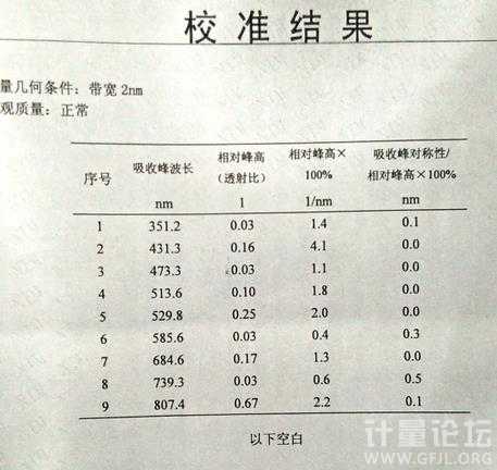 klj5206 發表于 2017-2-24 20:39 非常感謝你回復!是的該校準是依據JJG1034-2008《光譜光度計標準濾光器檢定規程》,通過學習JJG1034對第四列數據有了認識,但該校準證書的第三列數據說成是相對峰高X100%應該是不對的,這與其給出的單位也不對應哦!因為相對峰高是透射比的差,X100%后的單位不可能是1/nm。按JJG1034第三列應該是相對峰高X100%/光譜帶寬才對哦!你說是嗎? |