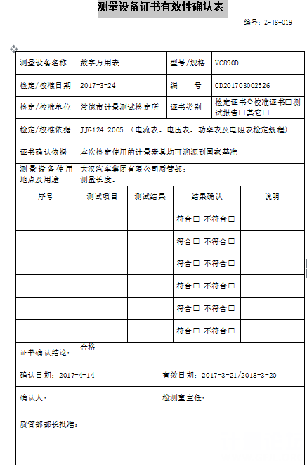 leon1985 發(fā)表于 2017-5-8 13:48 前輩不敢當(dāng),你太客氣了。計(jì)量管理從來(lái)就不是單純的管理,必須對(duì)相關(guān)領(lǐng)域的技術(shù)要有所了解,這也是計(jì)量和別的專業(yè)不同的地方。回到剛才的話題,如果是證書有效性確認(rèn),只要確認(rèn)證書信息沒有錯(cuò)誤就可以了。一般來(lái)說(shuō),按JJG檢定的合格出具檢定證書,不合格會(huì)出具校準(zhǔn)證書,所以如果你收到校準(zhǔn)證書的時(shí)候就要注意了,很有可能該測(cè)量設(shè)備檢定/校準(zhǔn)結(jié)果是不合格的,所以你可以在送檢的時(shí)候,在送檢單上注明要求檢定單位出具符合性判定,如:校準(zhǔn)結(jié)果滿足JJF的要求,就看你的溯源單位配不配合了。如果不配合,你需要回家上網(wǎng)按證書上使用的標(biāo)準(zhǔn)查查,看看結(jié)果是否滿足,再來(lái)填證書確認(rèn)表。從你的表格設(shè)計(jì)來(lái)看,似乎又有點(diǎn)測(cè)量設(shè)備計(jì)量確認(rèn)的意思,你可以參考我的表格進(jìn)行修改,測(cè)量設(shè)備的計(jì)量確認(rèn)我個(gè)人認(rèn)為應(yīng)該是使用部門的事情,能不能用是使用單位自己根據(jù)測(cè)量對(duì)象的要求來(lái)判斷的,你一個(gè)計(jì)量管理員是沒辦法那么全面的,所以在填完證書確認(rèn)表后,需要將證書進(jìn)行復(fù)印,發(fā)給使用部門留存,由使用單位根據(jù)校準(zhǔn)結(jié)果進(jìn)行測(cè)量設(shè)備的確認(rèn),你作為計(jì)量部門可以進(jìn)行指導(dǎo)。 |