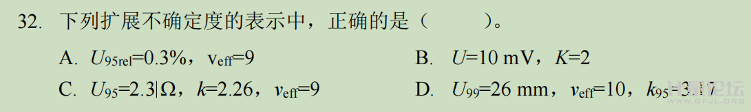 | 36題, D選項,K一般取2或3,這里K取2,一般用相對不確定度和測量結果表示,因此應該是測量結果±相對不確定度,題目給的是uc標準合成不確定度,Urel= uc * K;B選項,不能用uc來喝結果一起表示,而且K一般不會用1 |