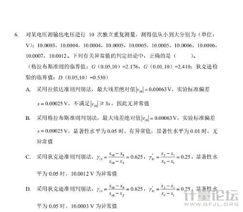 | 拉依達準則只適用于樣本數據量足夠大的情況,n>>10,一般為50個數據以上,此題樣本數據僅為10個,不可采用拉依達準則剔除異常值。A選項錯誤 |