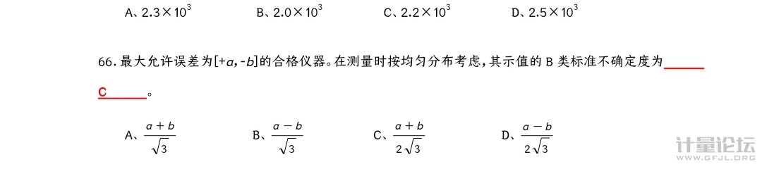 題目出得不好。 最大允許誤差可以表示為±Δ,同時也可以表示為【+Δ,-Δ】,按常規的表達方式,這里的Δ應為正常數。同理題干【+a,-b】中的a、b也應當是正常數,分子(既可能的誤差區間)應為a+b。 個人認為這里a、b的正負是一種表示習慣,并不構成考點,這道題目出得很失敗。 繼續推導,誤差區間半寬為(a+b)/2,B類不確定度為(a+b)/2根號3 |
