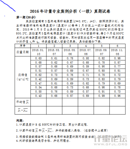 本帖最后由 增增增 于 2023-4-20 20:57 編輯 首先,說明A溫度計示值 誤差800.2-800=0.2,其示值偏高0.2,6列平均值的再平均值為0.72 得到(tB-tA)℃=0.72,說明tB=tA+0.72,由于tA偏高0.2。實際tB偏高0.52,修正為-0.52 第三問,曲線的X軸理論上應該是首次用A來測量核查標準B得出的實際值 ,即y0=800.322,y1=800.463,差值0.141,以后每次差值都小于修正值的擴展不確定度0.6就核查合格 |