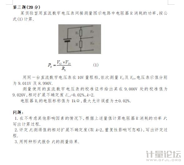 正文摘要:第三題第一小題是在不考慮其他影響因素的情況下,根據上述量值計算電阻器R消耗的功率P,寫出計算過程. 做題時是否要考慮“測量使用的直流數字電壓表的校準證書給出其在9.000V處的校準值為9.020V,相對擴展不確定度Urel= ... |