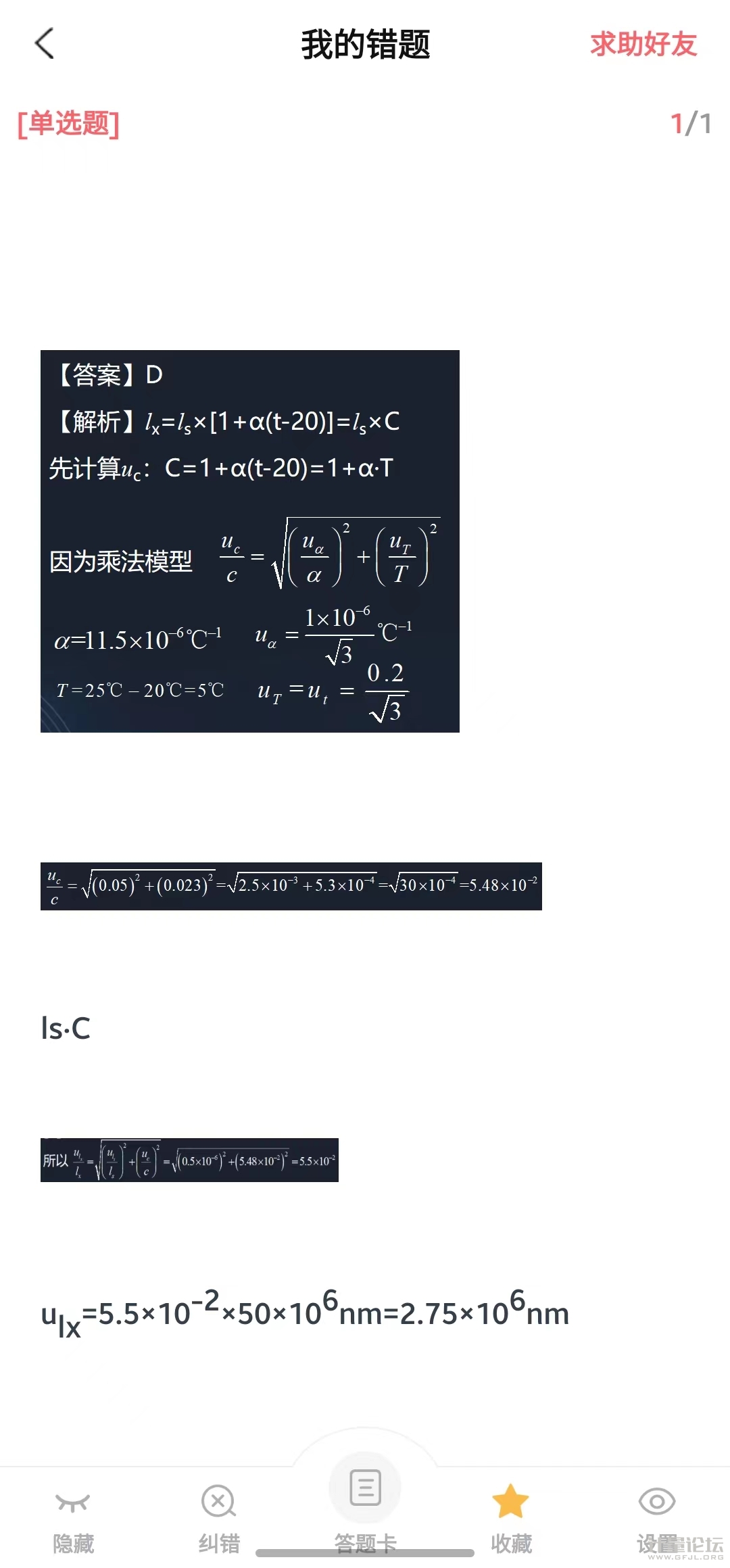 第一點,最關鍵的地方就是數學模型的求導,也就是靈敏系數的計算, 第二點,就是各影響量的標準不確定度的計算 第三點,就是合成不確定的計算,此題中各影響量之間是不相關的,所以,相關系數值為0,也就是合成不確定度=根號各影響量的不確定度的平方和。 第一點,靈敏系數,Ls的靈敏系數=1-a*(t-20)=1+11.5*10-6*(20-5) a的靈敏系數=(t-20)*Ls=(25-20)*50.000020 t的靈敏系數=a*Ls=11.5*10-6*50.000020 第二點,各影響因素的標準不確定度,自己可以算的 |