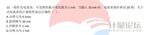 思之無味 發(fā)表于 2023-6-7 11:08 按定義,分辨力引起(儀器)相應(yīng)示值產(chǎn)生可覺察到變化的被測量的最小變化。 題中最小變化是1ma,分辨力就是0.5ma,10ma移動20格,說明一格子0.5ma,但沒有說能察覺到最小變化是0.5ma 所以分辨力是0.5ma,鑒別閥是1ma |