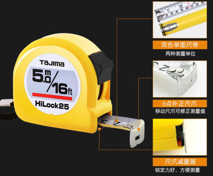 鋼卷尺的主要結構為具有一定彈性的整條尺帶,卷于金屬或塑料材料制成的尺盒或框架內。鋼卷尺尺端裝有拉環或尺鉤;制動式卷尺附有控制尺帶收卷的按鈕裝置;測深鋼卷尺的尺端帶有測深尺砣,它與尺帶的連接既可以是固定的,也可以是可拆卸的。