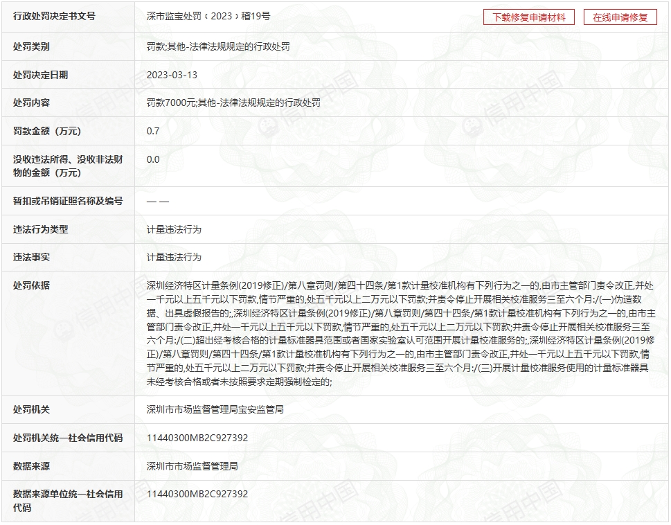 深圳經(jīng)濟特區(qū)計量條例(2019修正)/第八章罰則/第四十四條/第1款計量校準(zhǔn)機構(gòu)有下列行為之一的,由市主管部門責(zé)令改正,并處一千元以上五千元以下罰款,情節(jié)嚴重的,處五千元以上二萬元以下罰款;并責(zé)令停止開展相關(guān)校準(zhǔn)服務(wù)三至六個月:/(一)偽造數(shù)據(jù)、出具虛假報告的;,深圳經(jīng)濟特區(qū)計量條例(2019修正)/第八章罰則/第四十四條/第1款計量校準(zhǔn)機構(gòu)有下列行為之一的,由市主管部門責(zé)令改正,并處一千元以上五千元以下罰款,情節(jié)嚴重的,處五千元以上二萬元以下罰款;并責(zé)令停止開展相關(guān)校準(zhǔn)服務(wù)三至六個月:/(二)超出經(jīng)考核合格的計量標(biāo)準(zhǔn)器具范圍或者國家實驗室認可范圍開展計量校準(zhǔn)服務(wù)的;,深圳經(jīng)濟特區(qū)計量條例(2019修正)/第八章罰則/第四十四條/第1款計量校準(zhǔn)機構(gòu)有下列行為之一的,由市主管部門責(zé)令改正,并處一千元以上五千元以下罰款,情節(jié)嚴重的,處五千元以上二萬元以下罰款;并責(zé)令停止開展相關(guān)校準(zhǔn)服務(wù)三至六個月:/(三)開展計量校準(zhǔn)服務(wù)使用的計量標(biāo)準(zhǔn)器具未經(jīng)考核合格或者未按照要求定期強制檢定的; |