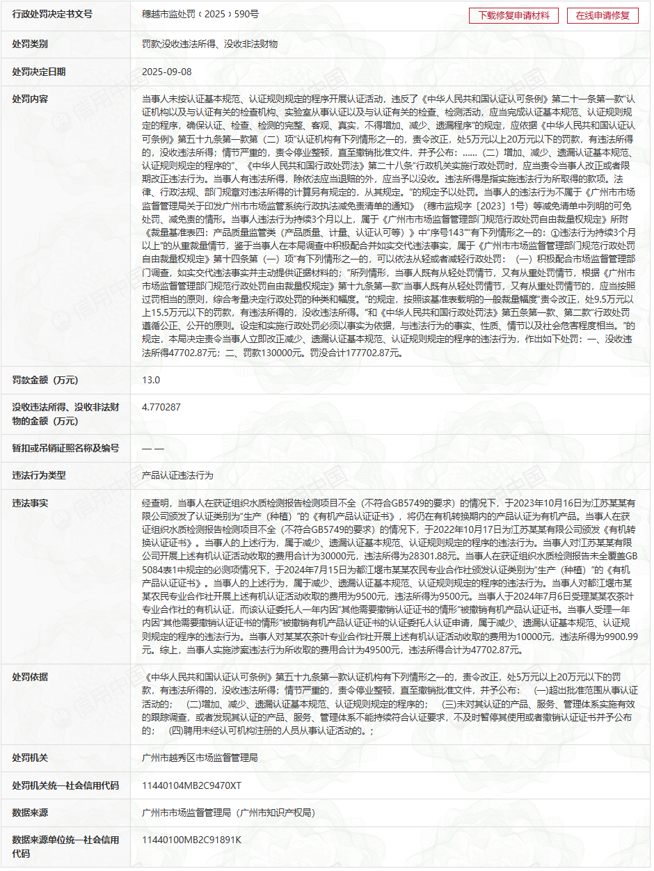 處罰結果: 當事人未按認證基本規范、認證規則規定的程序開展認證活動,違反了《中華人民共和國認證認可條例》第二十一條第一款“認證機構以及與認證有關的檢查機構、實驗室從事認證以及與認證有關的檢查、檢測活動,應當完成認證基本規范、認證規則規定的程序,確保認證、檢查、檢測的完整、客觀、真實,不得增加、減少、遺漏程序”的規定,應依據《中華人民共和國認證認可條例》第五十九條第一款第(二)項“認證機構有下列情形之一的,責令改正,處5萬元以上20萬元以下的罰款,有違法所得的,沒收違法所得;情節嚴重的,責令停業整頓,直至撤銷批準文件,并予公布:……(二)增加、減少、遺漏認證基本規范、認證規則規定的程序的”、《中華人民共和國行政處罰法》第二十八條“行政機關實施行政處罰時,應當責令當事人改正或者限期改正違法行為。當事人有違法所得,除依法應當退賠的外,應當予以沒收。違法所得是指實施違法行為所取得的款項。法律、行政法規、部門規章對違法所得的計算另有規定的,從其規定。”的規定予以處罰。當事人的違法行為不屬于《廣州市市場監督管理局關于印發廣州市市場監管系統行政執法減免責清單的通知》(穗市監規字〔2023〕1號)等減免清單中列明的可免處罰、減免責的情形。當事人違法行為持續3個月以上,屬于《廣州市市場監督管理部門規范行政處罰自由裁量權規定》所附《裁量基準表四:產品質量監管類(產品質量、計量、認證認可等)》中“序號143”“有下列情形之一的:①違法行為持續3個月以上”的從重裁量情節,鑒于當事人在本局調查中積極配合并如實交代違法事實,屬于《廣州市市場監督管理部門規范行政處罰自由裁量權規定》第十四條第(一)項“有下列情形之一的,可以依法從輕或者減輕行政處罰:(一)積極配合市場監督管理部門調查,如實交代違法事實并主動提供證據材料的;”所列情形,當事人既有從輕處罰情節,又有從重處罰情節,根據《廣州市市場監督管理部門規范行政處罰自由裁量權規定》第十九條第一款“當事人既有從輕處罰情節,又有從重處罰情節的,應當按照過罰相當的原則,綜合考量決定行政處罰的種類和幅度。”的規定,按照該基準表載明的一般裁量幅度“責令改正,處9.5萬元以上15.5萬元以下的罰款,有違法所得的,沒收違法所得。”和《中華人民共和國行政處罰法》第五條第一款、第二款“行政處罰遵循公正、公開的原則。設定和實施行政處罰必須以事實為依據,與違法行為的事實、性質、情節以及社會危害程度相當。”的規定,本局決定責令當事人立即改正減少、遺漏認證基本規范、認證規則規定的程序的違法行為,作出如下處罰:一、沒收違法所得47702.87元;二、罰款130000元。罰沒合計177702.87元。