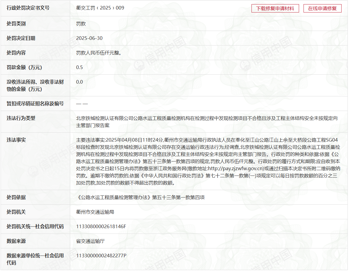 主要違法事實:2025年04月08日11時24分,衢州市交通運輸局行政執法人員在奉化至江山公路江山上余至大橋段公路工程SG04標段檢查時發現北京鐵城檢測認證有限公司存在交通運輸行政違法行為,經調查,北京鐵城檢測認證有限公司公路水運工程質量檢測機構在檢測過程中發現檢測項目不合格且涉及工程主體結構安全未按規定向主管部門報告。行政處罰的種類和依據:依據《公路水運工程質量檢測管理辦法》第五十三條第一款第四項的規定,罰款人民幣伍仟元整。行政處罰的履行方式和期限:應自收到本處罰決定書之日起15日內將罰款繳至浙江政務服務網(繳款地址:http://pay.zjzwfw.gov.cn)或通過掃描本決定書所附二維碼繳納罰款。逾期不繳納罰款的,依據《中華人民共和國行政處罰法》第七十二條第一款第(一)項規定可以每日按罰款數額的百分之三加處罰款,加處罰款的數額不得超出罰款的數額。