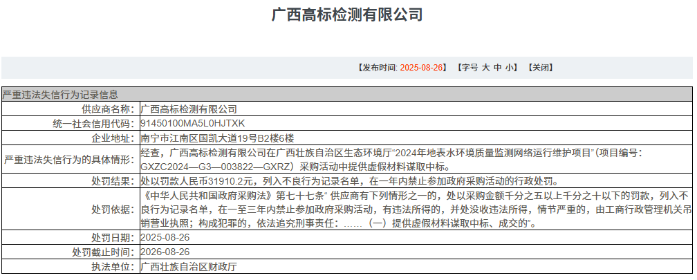 處罰事由: 經查,廣西高標檢測有限公司在廣西壯族自治區生態環境廳“2024年地表水環境質量監測網絡運行維護項目”(項目編號:GXZC2024—G3—003822—GXRZ)采購活動中提供虛假材料謀取中標。